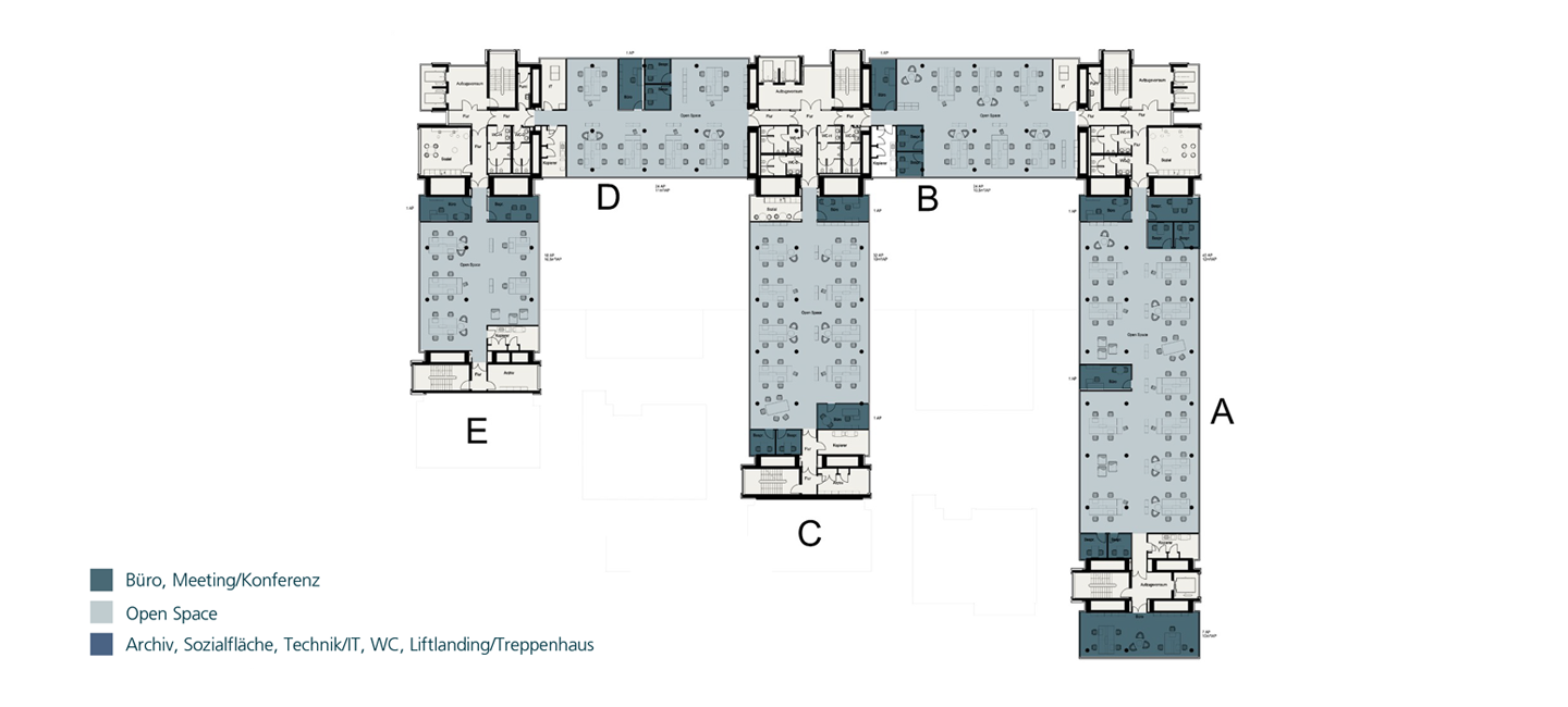 Flexible Grundrissgestaltungsmöglichkeiten (Einzel-, Kombi-, Großraumbürolösungen)